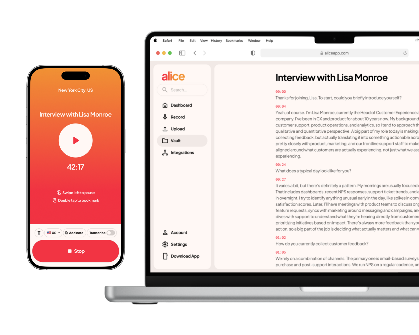 Instead of yet another silo, Alice pushes recordings, transcripts, analysis to you for backup or immediate use.